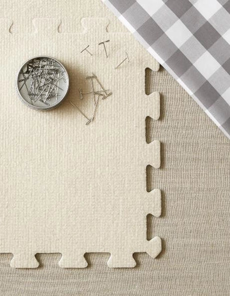 Very low, lightly barbed pile fabric covering gently grips your knitting without pilling or leaving fibers. Can be assembled in a variety of sizes from a square for sweater pieces, a long rectangle for scarves or a triangle for shawls. Each tile has a thick backing of waterproof EVA - suitable for use on any surface since moisture won’t seep through